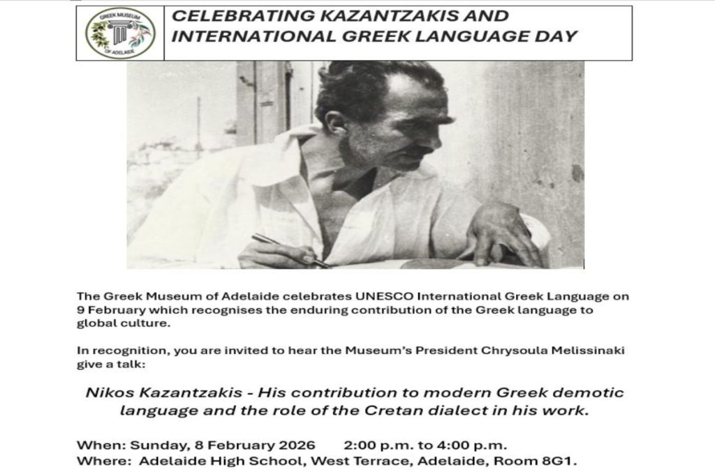 Το Ελληνικό Μουσείο Αδελαΐδας παρουσιάζει ομιλία για τον Νίκο Καζαντζάκη και τη γλωσσική του κληρονομιά στο πλαίσιο του εορτασμού της Παγκόσμιας Ημέρας Ελληνικής Γλώσσας.